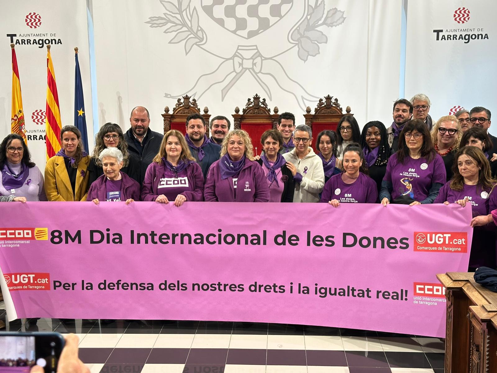 Aquest migdia el saló d’actes de l’Ajuntament de Tarragona s’ha convertit en l’escenari de reivindicació del drets de la dona, coincidint amb la celebració del 8M aquest diumenge. El saló s’ha omplert de color lila, tant per part dels representants de la classe politica, com de totes les dones que han ocupat els escons de l’Ajuntament i tota la sala.